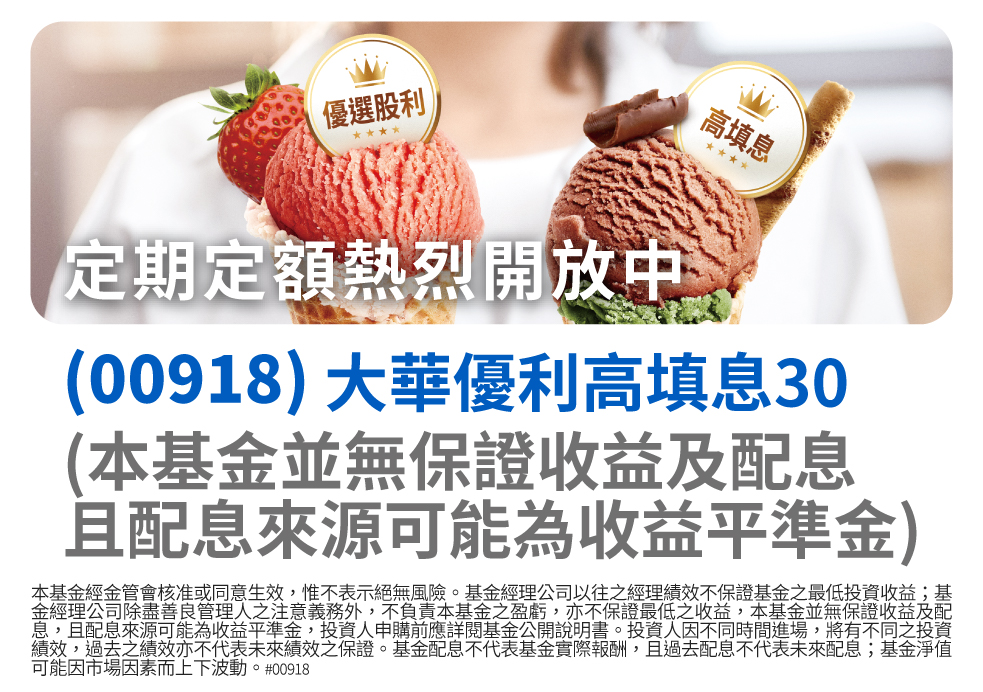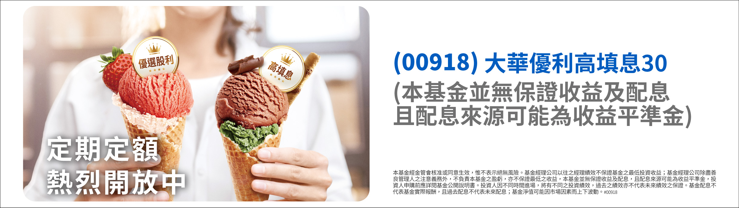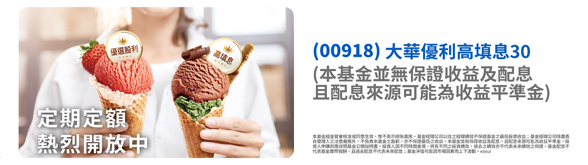 台灣第一檔專注於優選股利+高填息的台股ETF, (00918)大華優利高填息30(本基金並無保證收益及配息且配息來源可能為收益平準金)